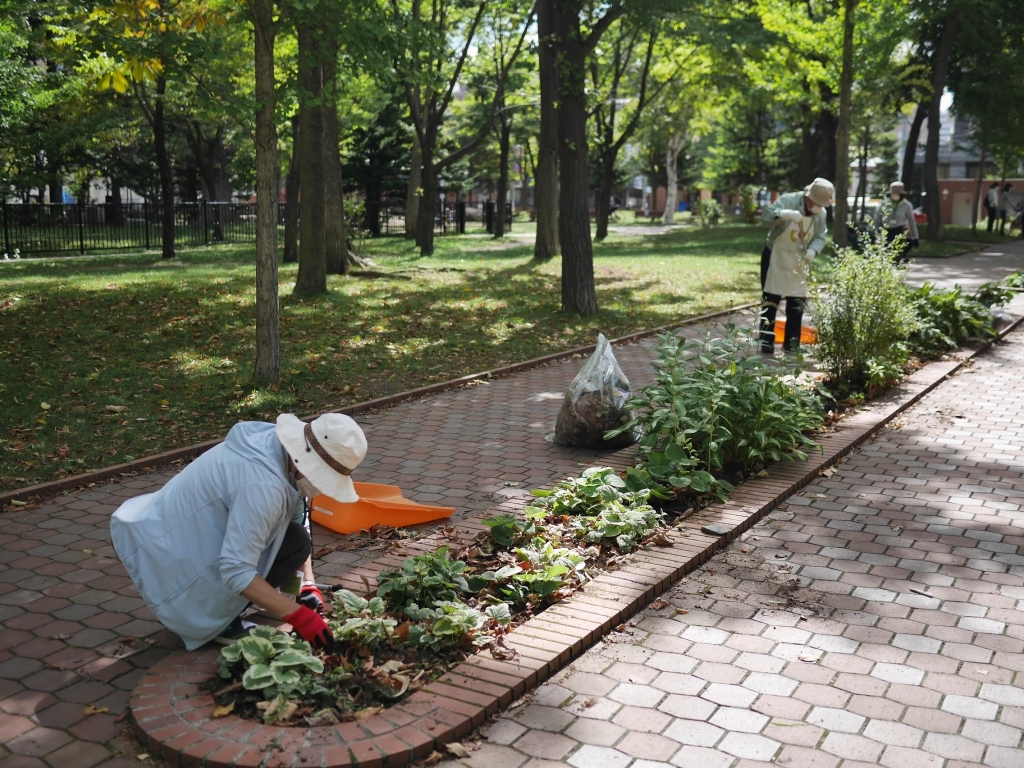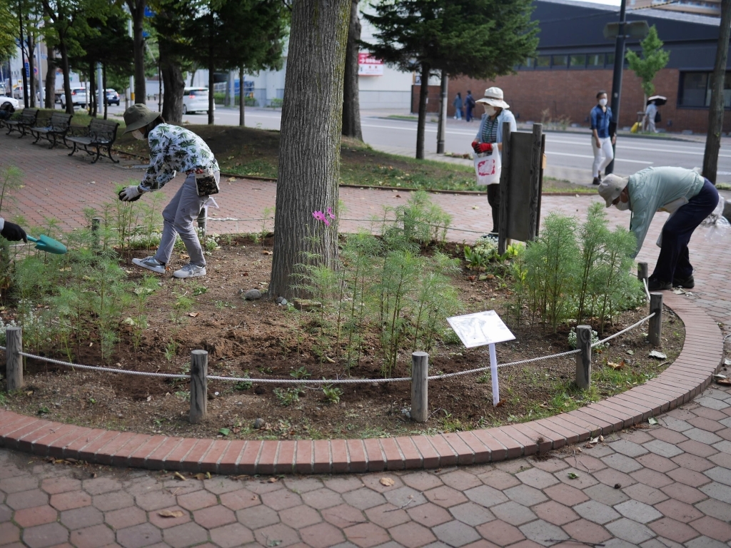 9月14日、永山記念公園花壇づくり第6回目の活動をしました。気持ちのよい秋晴れの下、9名が参加して花壇の除草、切り戻し、追肥などを行いました。