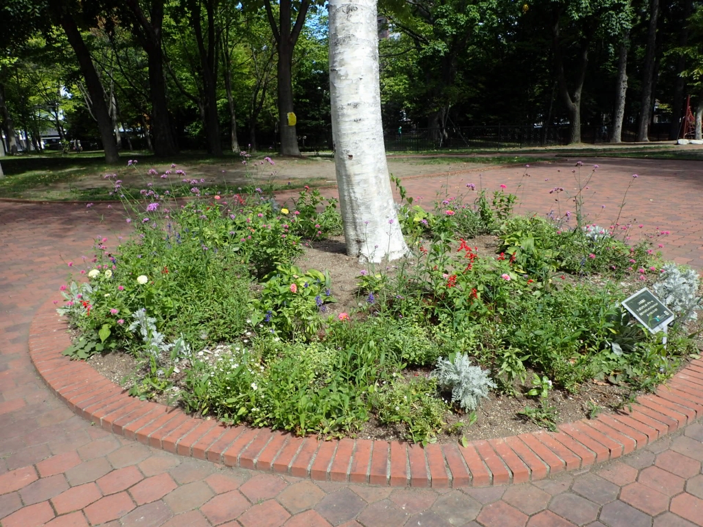 シラカバの円形花壇では、こぼれ種で増えた三尺バーベナ―が元気に花壇を彩っていました。