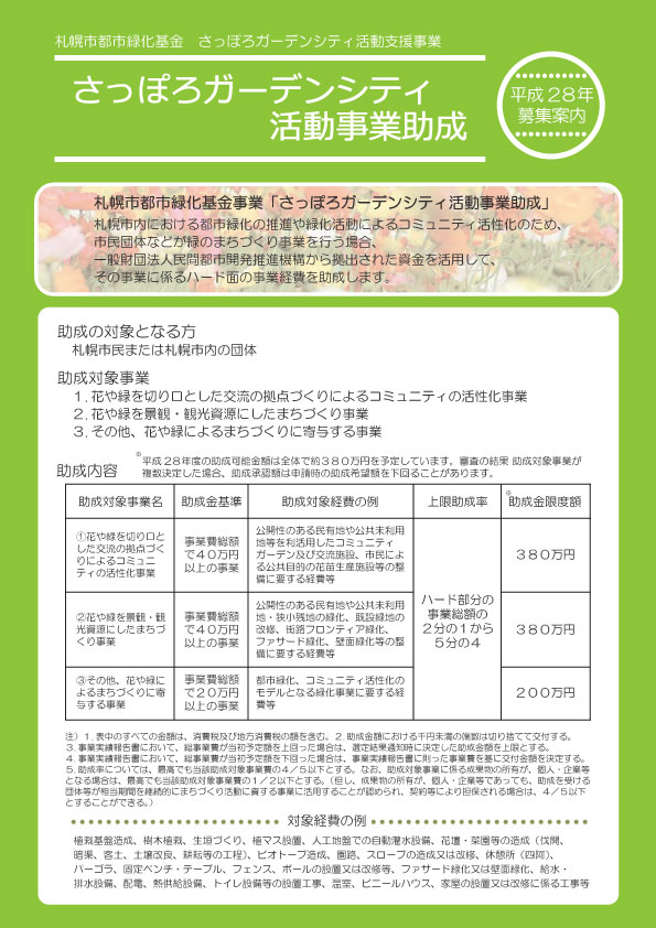 詳しくはチラシや、札幌市公園緑化協会都市緑化基金のページをご覧ください。