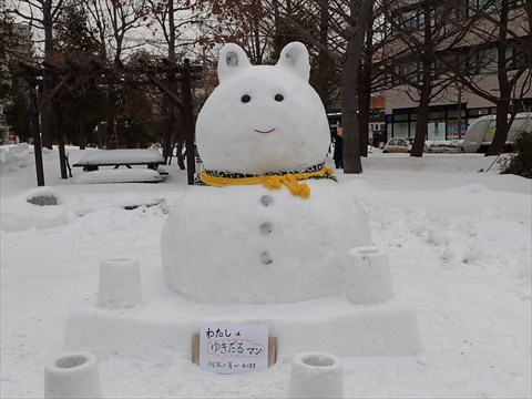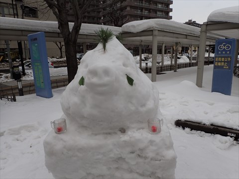 市立病院の入口から入ると、今年の干支のイノシシの雪像や札幌市の雪活キャラクターのゆきだるマンの雪像が出迎えてくれました。