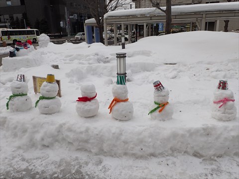 左のニコニコ笑い顔の雪だるまはスタッフが、右は市立病院の保育園に通う4~5歳の園児が2人で1つ作った雪だるまです。