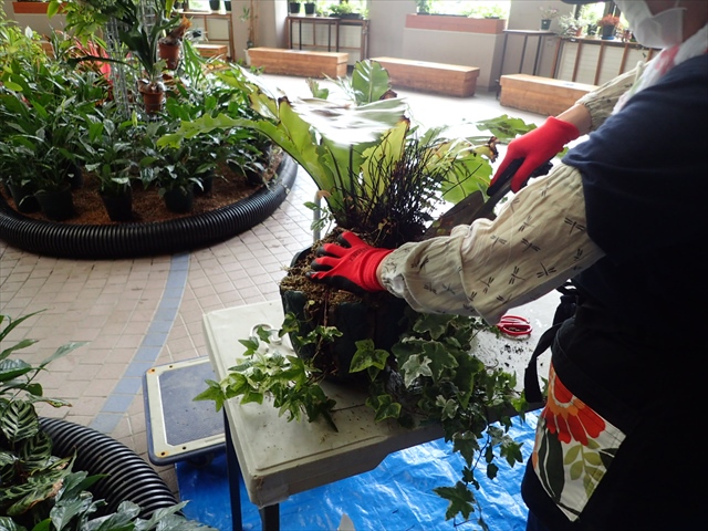 こちら(写真下左)は長く展示されていた観葉植物のハンギングバスケットの解体中。