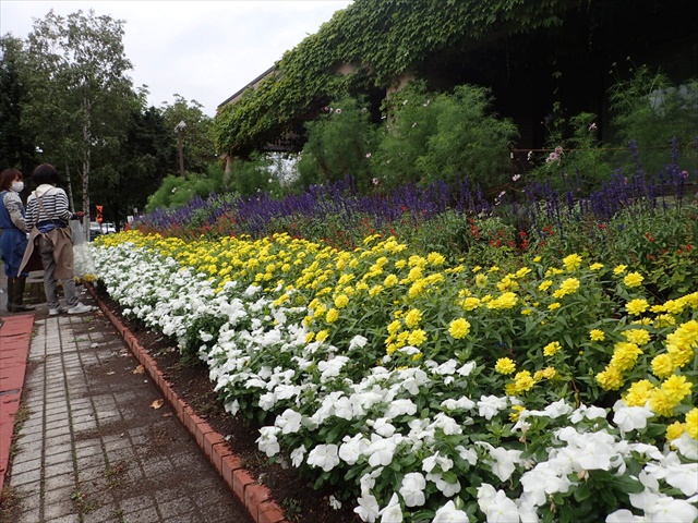 雨がやんだので屋外へ。入口前のボーダー花壇は今年は男性メンバーのデザインで、富良野の四季彩の丘をイメージしたのだとか。はっきりした色合わせが目を引きますね。