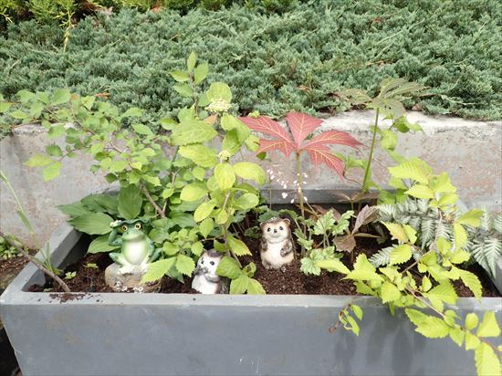 植えてあるのは、ハルニレとイタヤカエデの小さな苗、ヤグルマソウ、ギボウシ。葉っぱの影から動物たちがのぞいていて、「かわいい」と誰もが口にしそうな寄せ植えの出来上がり。