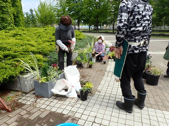 こちらは、男性のメンバーが並べてみた植物の配置を、少し離れたところから眺めて検討しているところ。