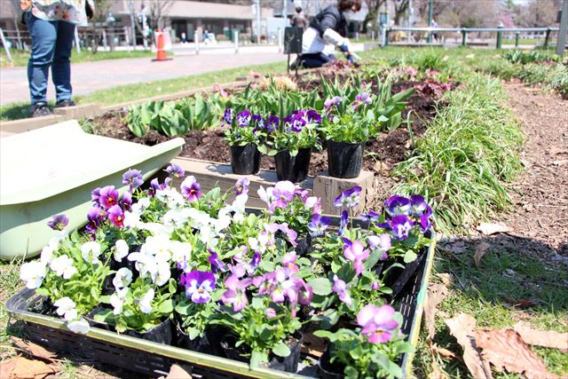 パンジー、マーガレット、ダイアンサスなど花苗を並べ、数人で場所を決めていきます。