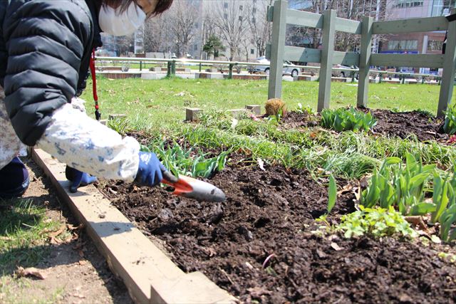 まずは植える場所に腐葉土をたっぷりとすきこんで土づくりから。芽吹きだした宿根草とチューリップを避けてシャベルを挿し込んでいきます。宿根草の大切な根や芽を傷つけてしまいそうですが、「もしも間違えて切ってしまったとしてもそこから更新すると考えて」と教わりました。