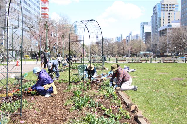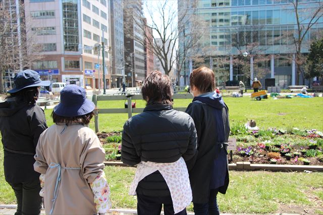 大通公園では早くもサクラやコブシの花が咲きはじめ春ムード。花壇に植えられた花を見て、喜んでメンバーに声をかける通行人の方もいらっしゃいました。