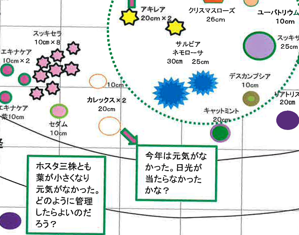 メンバーさんがお持ちの図面の中には、植物の名前と株の大きさや改善点など、細かく記されていました。