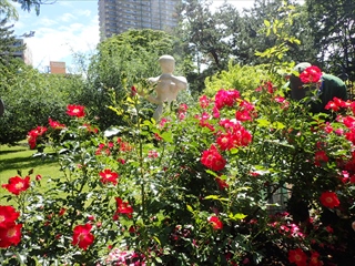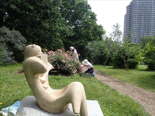 花壇のバラと対応して置かれている彫刻との「調和を楽しんで」と会の代表の戸城さん。山内壮夫作の彫刻が花に囲まれて柔らかい雰囲気を醸し出し、イメージが広がります。