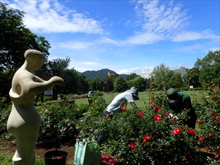 芝生広場には、保育園のお子さんたちがかわるがわる訪れ、楽しそうな声が間近に聞こえます。きれいなバラの花をカメラに収めようと近づいて来られる方や、メンバーに話しかけてお花について質問する方も。公園を訪れる方と交流しながらの作業が印象的でした。