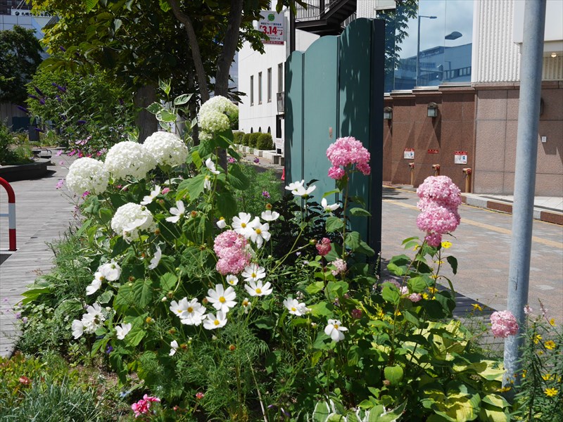 新さっぽろ駅2番出口近くの花壇では、アナベルが満開。ここは厚別区のガーデニング講習会の終了生でつくった団体「アナベル」のみなさんが管理しています。