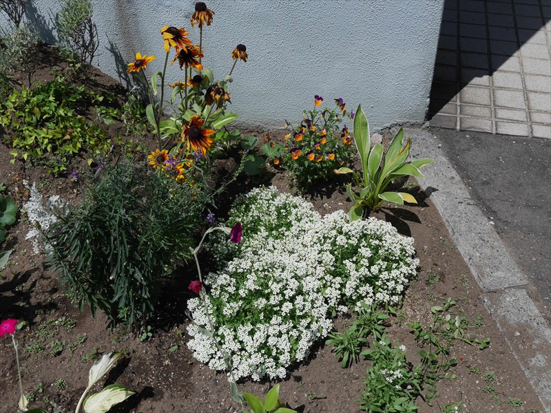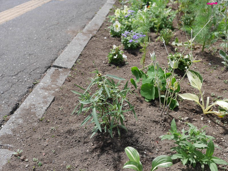 高橋さんは、ホテルエミシア前の交差点の花壇や、近所の薬局の花壇の手入れもしています。株分けした宿根草や、種から育てた花が植えられていました。これから大きくなるのが楽しみですね。