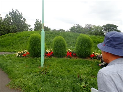 「2mもあるコキアがあるんだよ」と教えられて新琴似北公園に行ってみると、ありました!人の背丈よりも大きなコキアが!風で倒れると困るので支柱が立ててあるそうです。