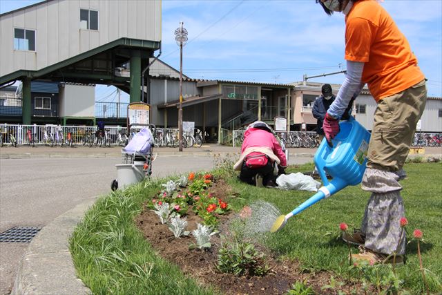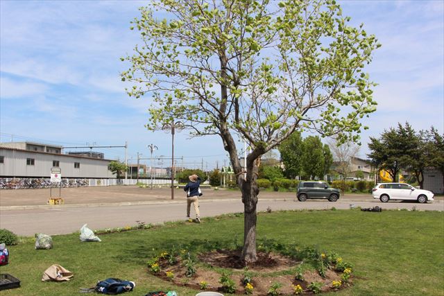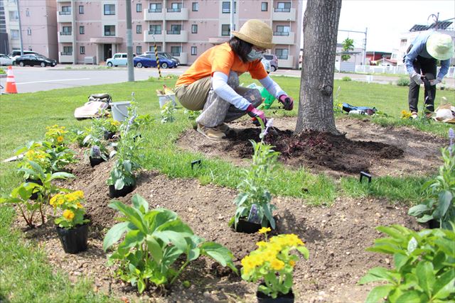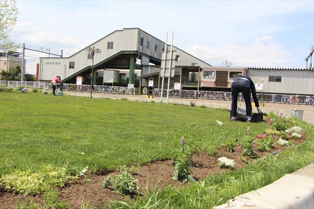 JR百合が原駅前ロータリーに、登録団体「百合が原花壇を造り隊」が花植えをしました