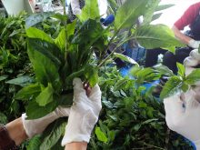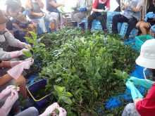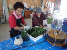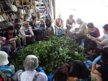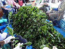 参加予定のみなさんが揃ったところで、主催者のあいさつ、指導担当者からのあいさつと説明があり、再びみんなで葉の収穫作業をします。