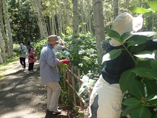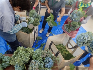 アジサイの摘み取りの様子 摘み取ったアジサイを抱えたメンバーさん