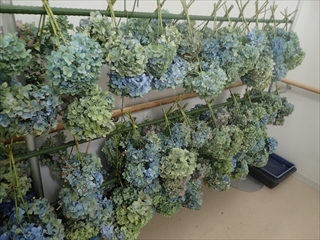 アジサイの葉を取り、花が重ならないように6本ずつ束ねて事務所のドライコーナーで乾燥します。流れ作業も手慣れたもの。あっという間にアジサイの束が出来上がりました。