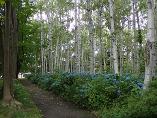 シラカバの道の通路際にアジサイが並んで植えられています。暑さと乾燥で少し疲れ気味のアジサイ(写真左下)ですが、8月7日の同じ場所(写真右下)と比べてみると、だいぶ花の色が薄くなっていますね。こうなると切り時。アジサイの花の茎をよく見て、充実した芽の上でおよそ30cm位の長さに切りました。