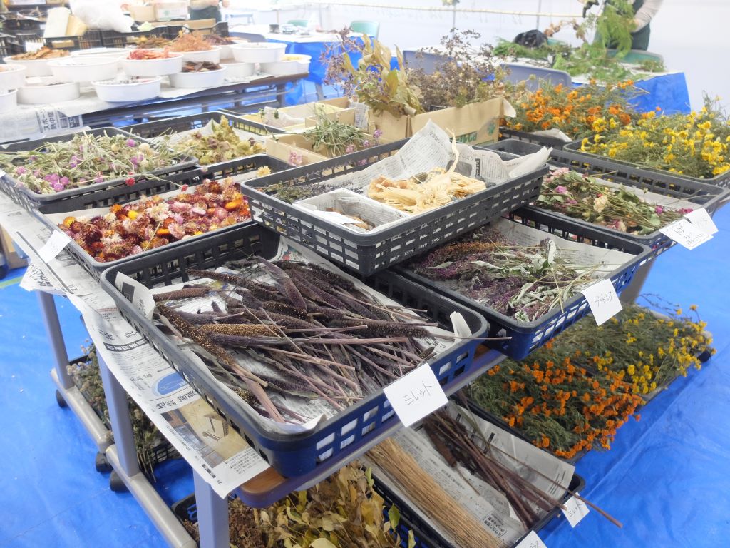 豊平公園の会議室には展示で用いた植物や育てた植物をドライフラワーにしたもの、園内で採取した木の実や落ち葉など様々な形の花材がずらーっと並びます。リースになる前の花材を見るだけでも十分に楽しめるほど。