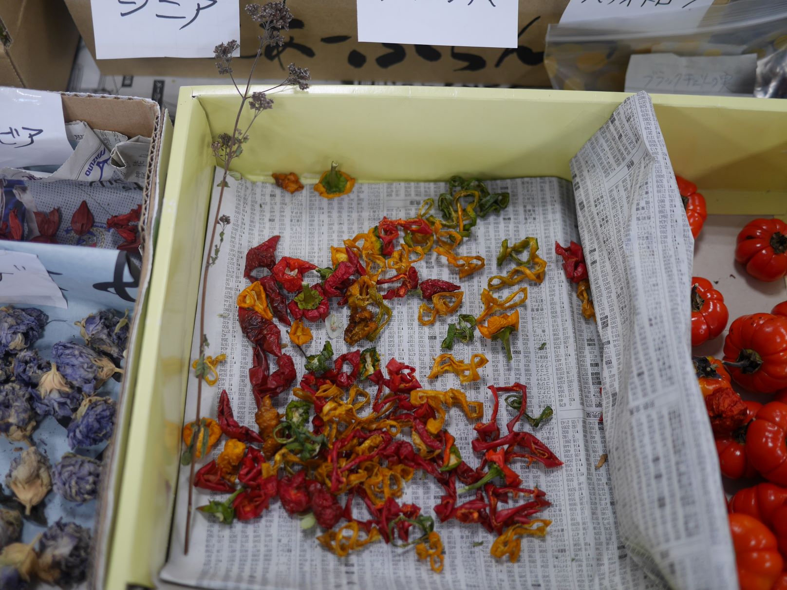 変わったものではミニパプリカのスライスを乾燥させたものやソラナム、トウモロコシ等も並んでいました。