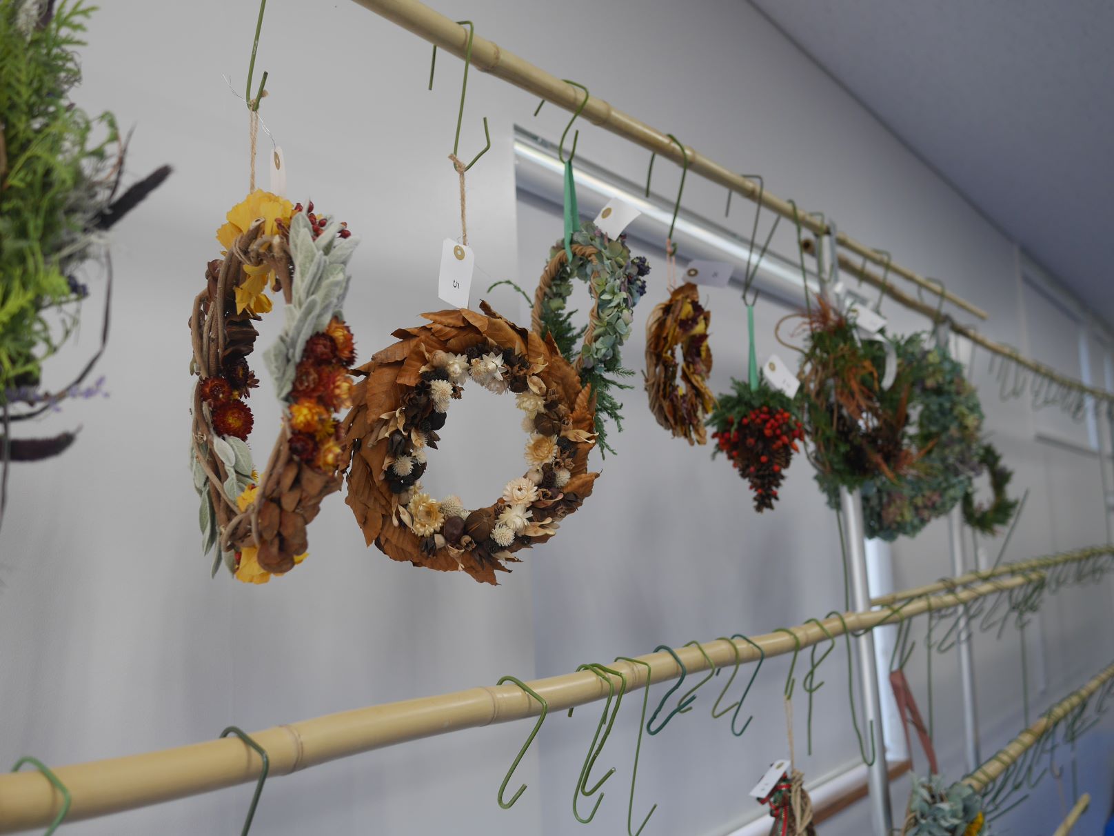リースのベースも園内で採取したフジのつるを編んだものやトウを三つ編みにしたもの、大・小の円が二重になったもの等、材質だけでなく、形も様々です。ベースは花とハーブの会の皆さんと豊平公園の職員とで作ったそうです。