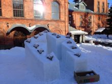 バケツに一升瓶を入れその周りに雪を入れて固めていきます。そして瓶を取り除いて逆さまにしてスノーキャンドルは出来上がります。