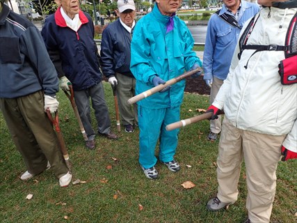 シーズネットの男性は最初穴あけを担当しました。白いテープの巻いてあるところまで土に挿して穴を広げるように大きく回し、こぶし大の大きさの穴にします。
