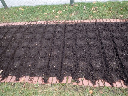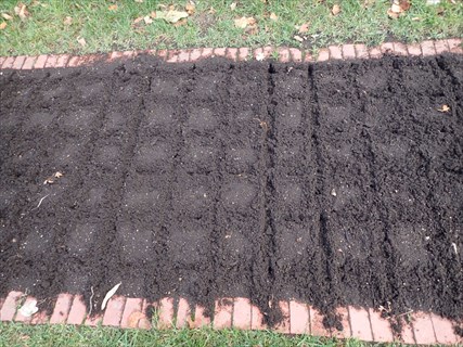 きれいに整地された花壇の土にはきれいな升目が描かれています。この升目の交点に穴を開けますが、使うのはスコップの柄を利用していました。