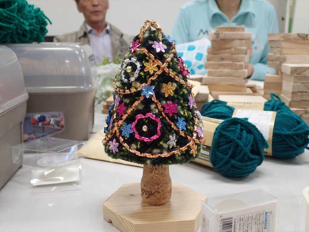 この日は、講師役のメンバーが試作してきたミニツリーを見ながら、毛糸の色や毛糸を巻く回数、毛糸の入手先、当日の作業の進め方など意見を出し合い、次回の試作作りに向けて話はどんどん進んでいきました。