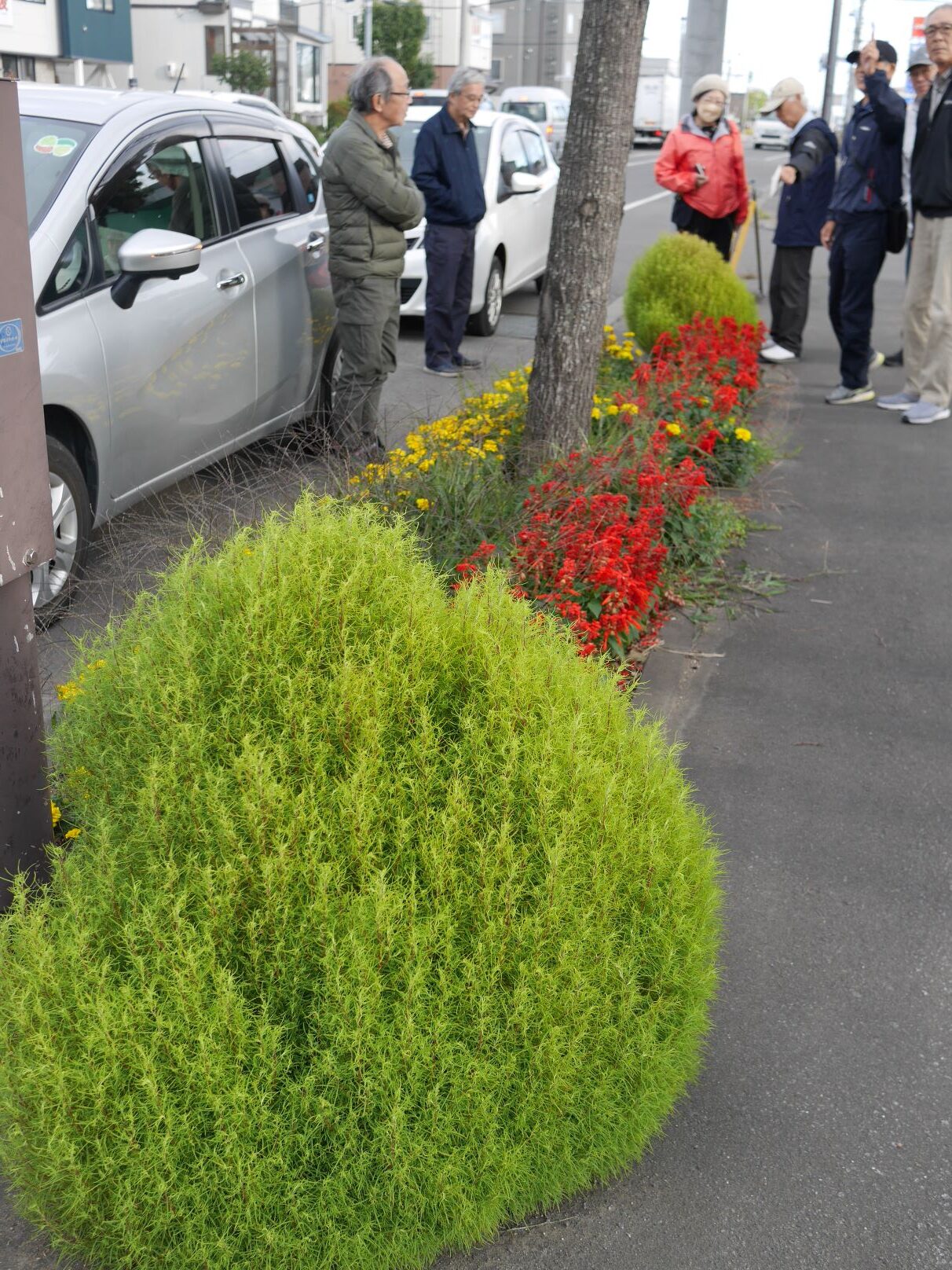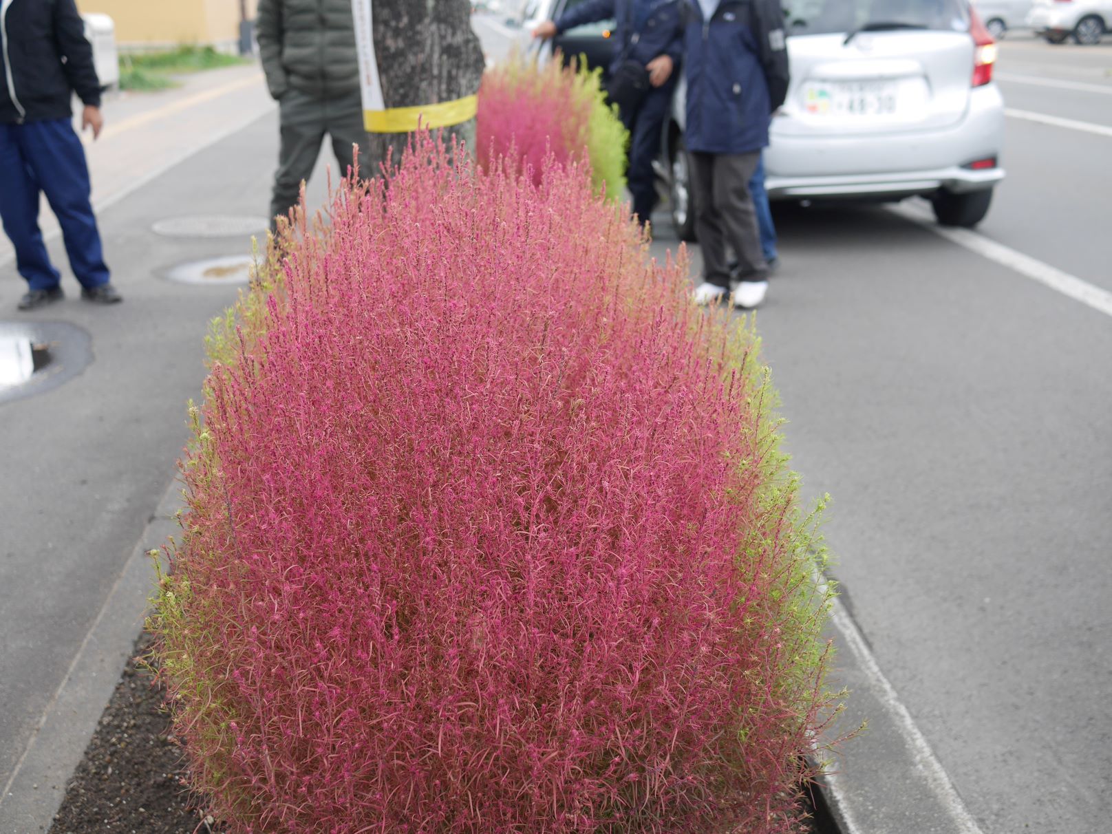 各町内会の方が自分たちの管理する街路ます前でそれぞれにコキアの出来栄えや植えた時期、どんな苗を使用したか等を説明しながら観察会を行いました。