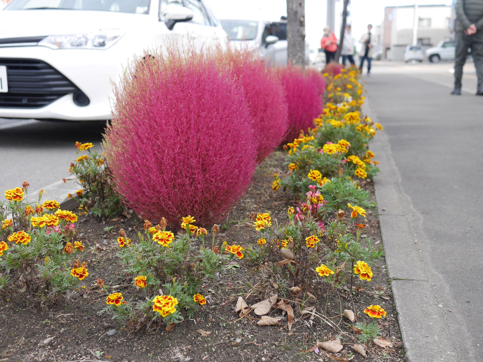 各町内会の方からの説明を聞いていると、苗の入手方法は園芸店で購入した町内会とこぼれ種から育てた町内会とがあるようですが、植えた時期はだいたい5月下旬ころとのこと。