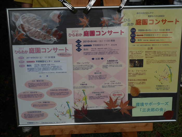 手作りの木製パネルには、第1回から12回までの庭園コンサートのポスターが貼られていました。今までさまざまな団体がセンターで演奏し、清田区の方に楽しまれてきたことがわかります。