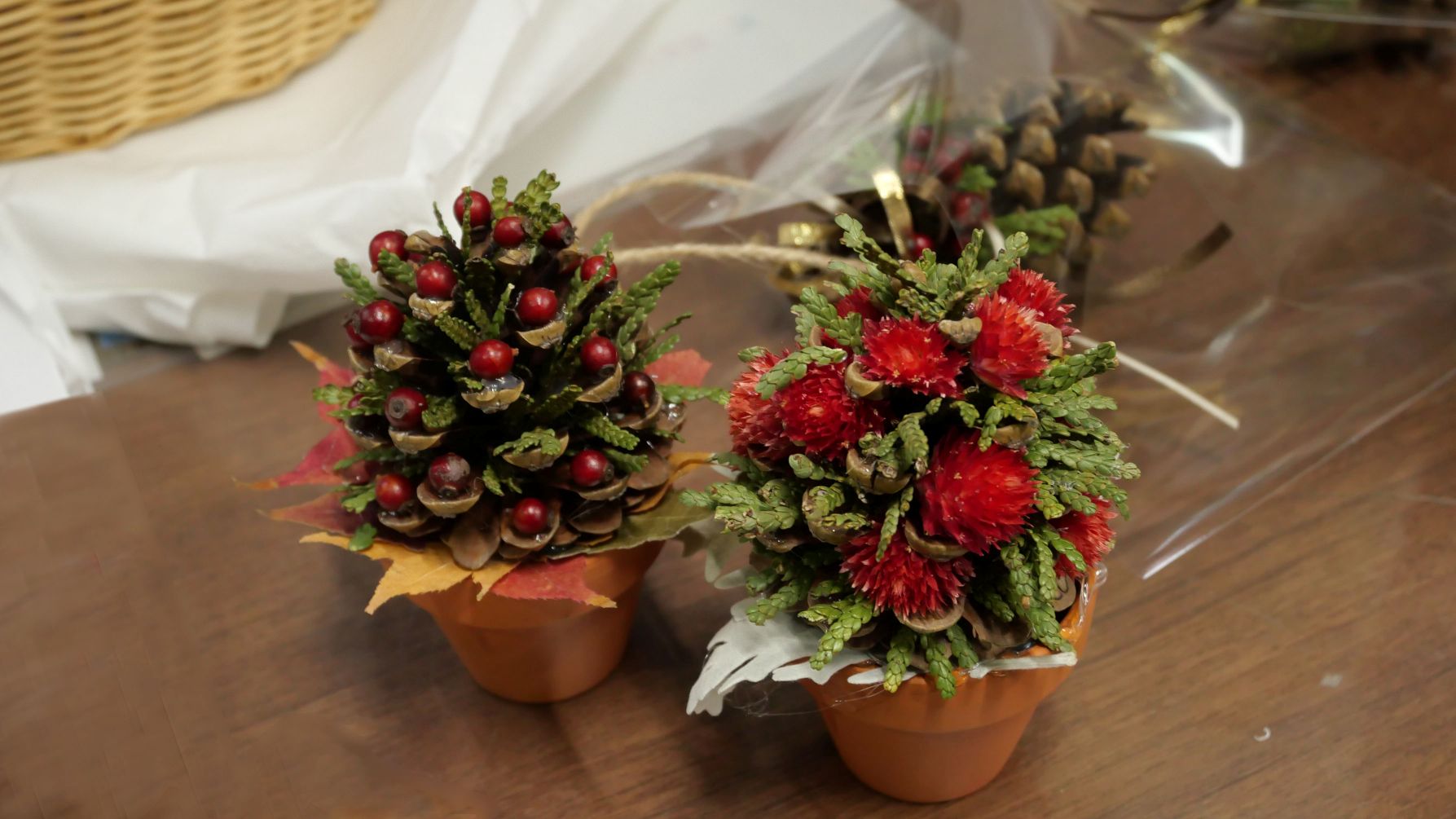 クリスマスらしい赤い実の入った作品や大人っぽいシックな色味の作品、コットンを用いた温かな作品等、各フローリストさんの個性が光る展示となっています。