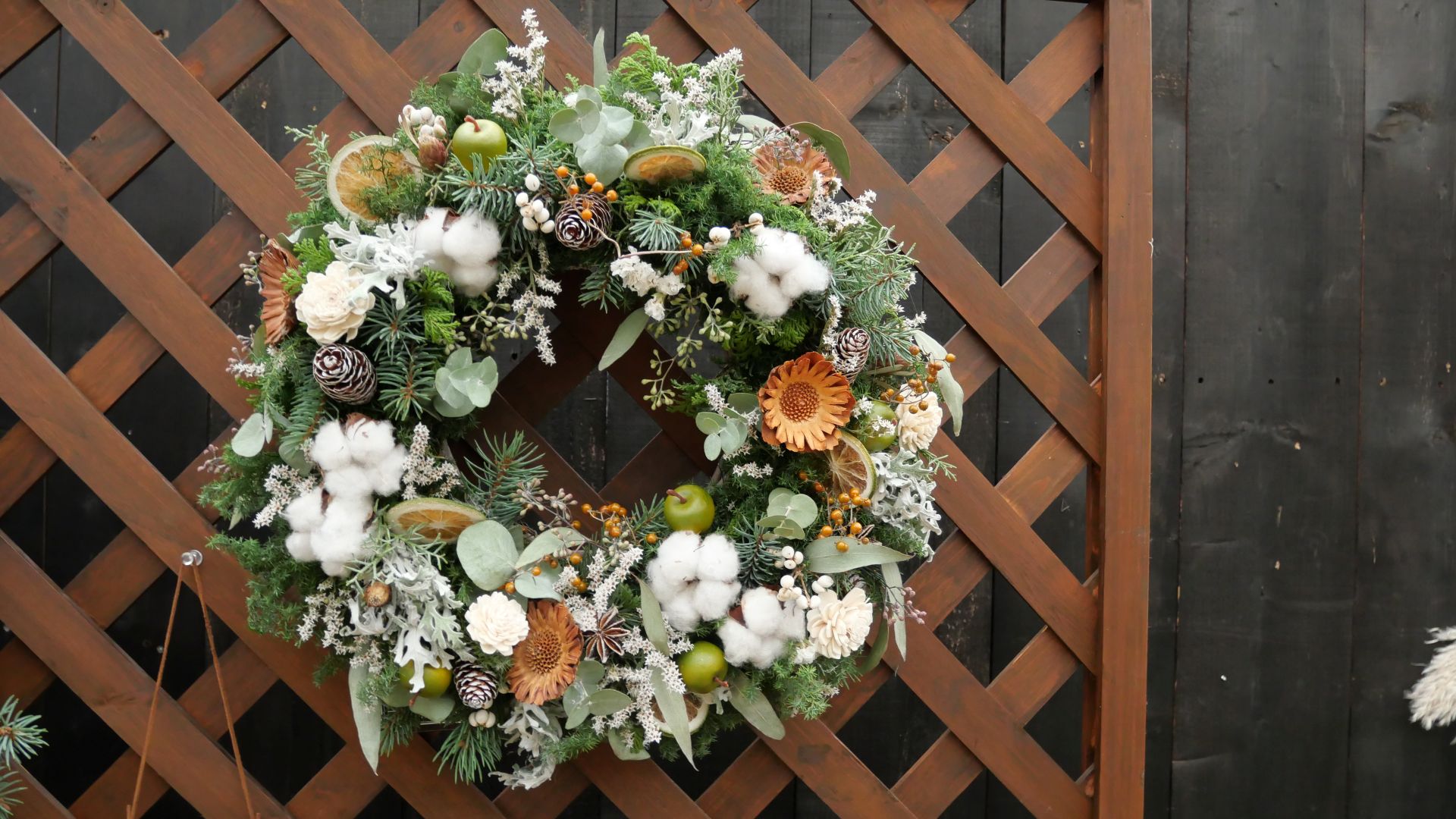 今年は市内で活動する7名のフローリストの方が制作したリースやスワッグ等が展示されています。
