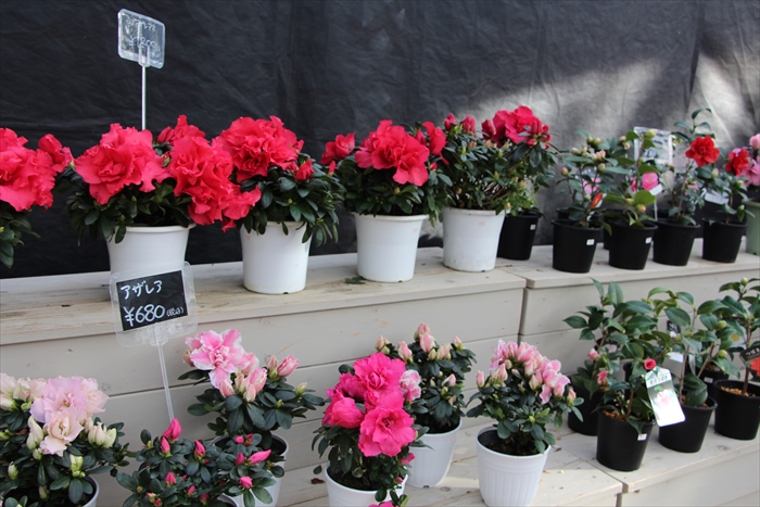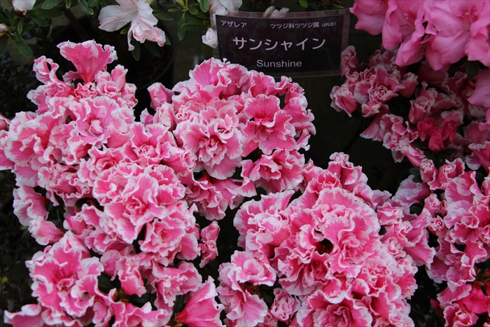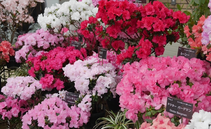200鉢ほどのアザレアの株はほぼすべて満開で、来場者を迎えています。