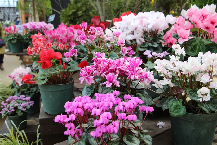展示室の奥、ガーデンショップではアザレアやシクラメンの鉢が販売されています。こんな一鉢が家にあると気分も明るくなるでしょう。