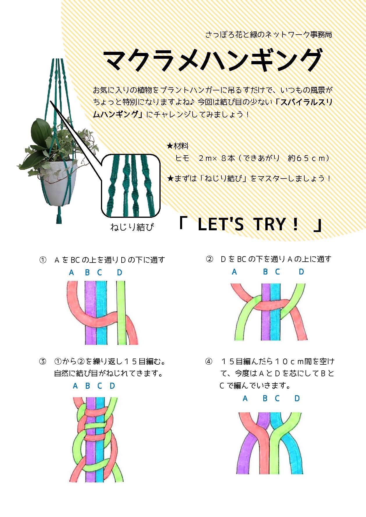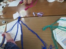 さらに交換会が終わった後に、会場のレイアウトを変更し「マクラメハンギング」づくりを実施しました。ヒモを結んで植木鉢を吊るすプラントハンガーを、マクラメ編みを用いて作りました。