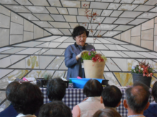 寄せ植えの講師は、花と緑のボランティア団体「あるば・ローズ」、滝野フラワーガイドボランティアの会に所属し、ハンギングバスケットマスターの資格をお持ちの安孫子さんです。