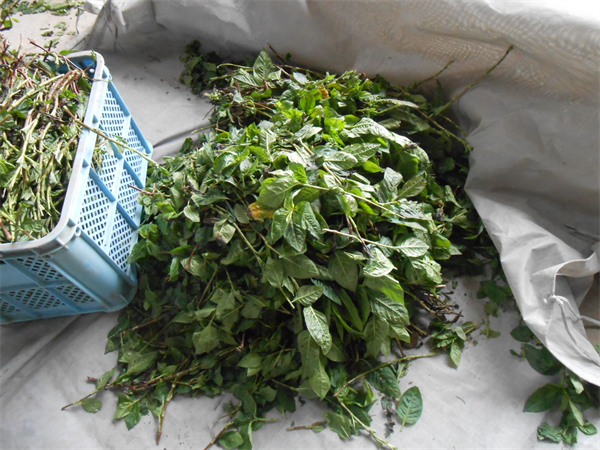 収穫した藍から葉をもぎ取り、ミキサーにかけて染め液をつくります。