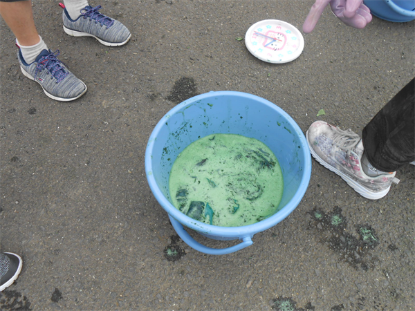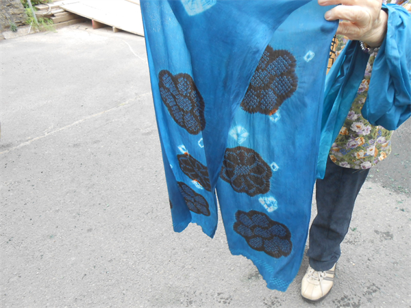 藍の液は最初は緑ですが、布を浸けて空気に触れさせるときれいなブルーに!