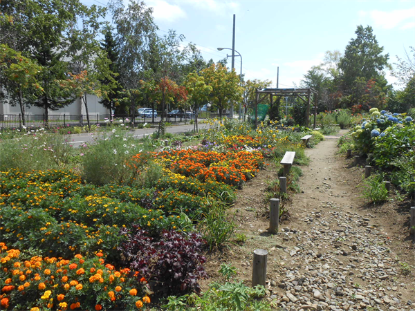 藍の生葉染めの後に、篠路コミュニティセンター横のコミュニティガーデン「コスモスふれあい花壇」にお邪魔しました。