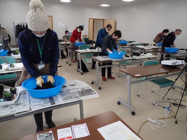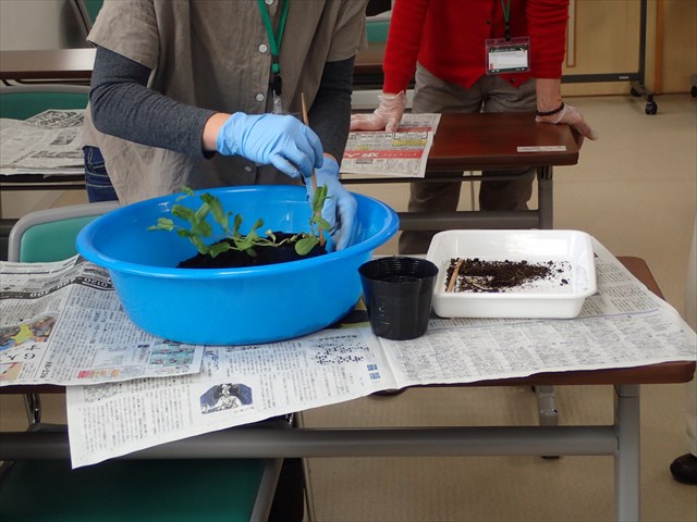 ここで先輩サポーターさんに丁寧な植え替えの実演をしながら教えていただき、それぞれ実習を行いました。