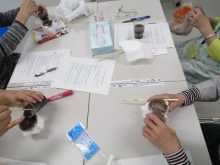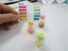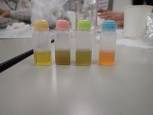 ろ過ができたところで、土壌酸性度の簡易測定をしました。pH測定液を使った測定では、その人が持ってきた土によって全く違う色が現れました。
