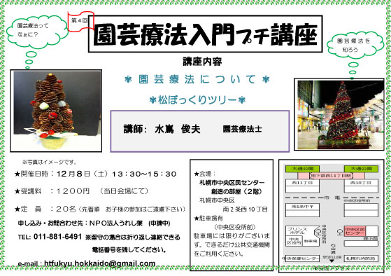 新着情報 関連行事ご案内 第4回 園芸療法入門プチ講座のお知らせ 2012年11月20日 「第4回 園芸療法入門プチ講座」が開催されます。 この機会に、園芸療法に触れてみてはいかがでしょうか? 詳しくはチラシをご覧ください。クリックすると拡大できます。 Tweet 次へ 一覧へ戻る 前へ カテゴリー 新着情報 ブログ 事務局より ボランティア募集 主催イベント報告 団体活動紹介 ガーデナー紹介 関連行事ご案内 主催事業・イベント 講習会・検定試験 札幌市内の公園情報 2025-12-23 大通公園 ガイドボランティアさんの年内活動終了 2025-12-23 旭山記念公園 旭山記念公園野鳥情報2025年12月23日(火曜日) 2025-12-22 大通公園 さっぽろホワイトイルミネーション大通会場は12月25日まで 2025-12-22 滝野すずらん丘陵公園 滝野スノーワールド、明日(12/23)から開園!! 2025-12-21 前田森林公園 年末年始の管理事務所閉鎖について 2025-12-21 百合が原公園 冬至、冬中、冬始め(ミモザ苗販売のお知らせも 2025年12月21日) 2025-12-20 豊平公園 年末年始の豊平公園緑のセンター休館と駐車場閉鎖のお知らせ 2025-12-19 百合が原公園 今年最後のボランティア活動(2025年12月19日)