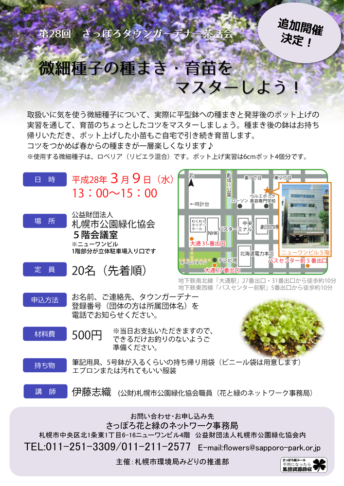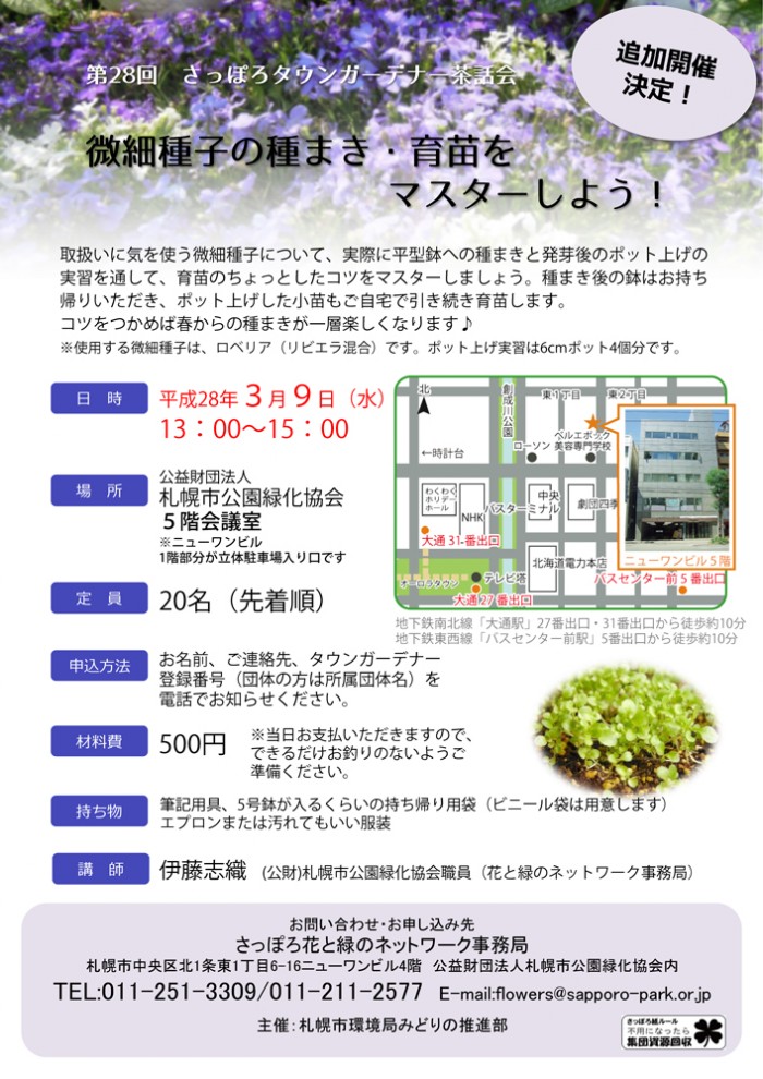 さっぽろタウンガーデナーのみなさんへご案内を差し上げておりました2つの茶話会(講習会)のうち、「微細種子の種まき・育苗をマスターしよう!」の追加開催が決定いたしました!