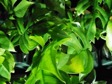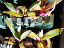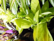 オリヅルラン、ポトスライム、ヒメモンステラ、ムラサキオモトが使われています。