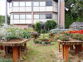 ガーデンの中央部のレイズドベッドは園芸療法を学ぶ学生さんのデザインです。