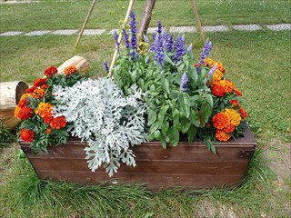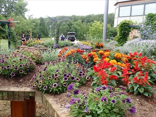 白いアナベルが見頃できれいでした。ガーデンの周りや大学の入口にも寄せ植えが並置かれています。マリーゴールドのファイヤーボールとブルーサルビアが植えられていて統一されていました。