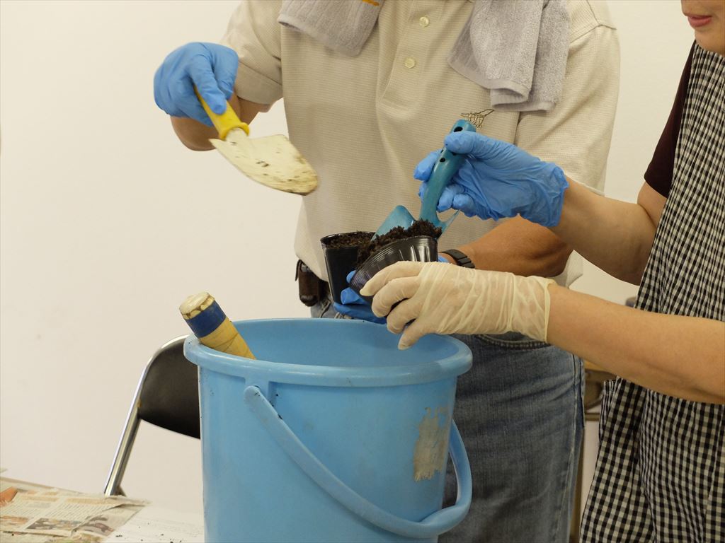 培養土をいくつかのバケツに入れて、2~3人くらいでそこからポットに土を入れていきます。